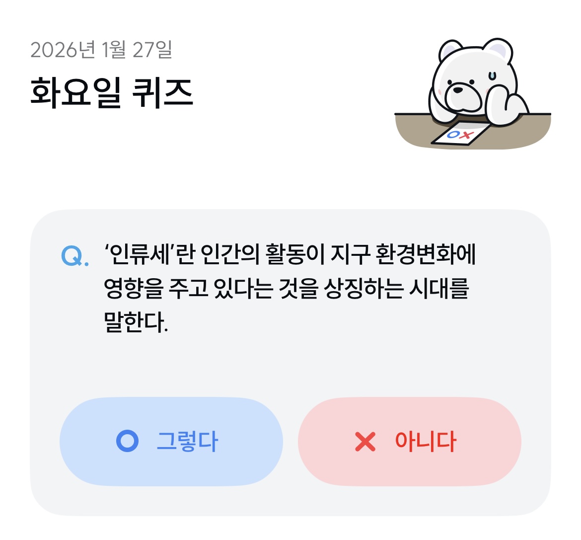 기후동행퀴즈 1월 27일자 문제는 '인류세' 개념에 대한 이해입니다. 인간의 활동이 지구 환경 변화에 영향을 준다는 시대적 용어, 인류세의 의미와 정답을 확인해보세요.