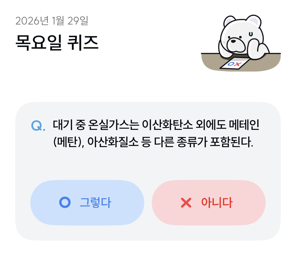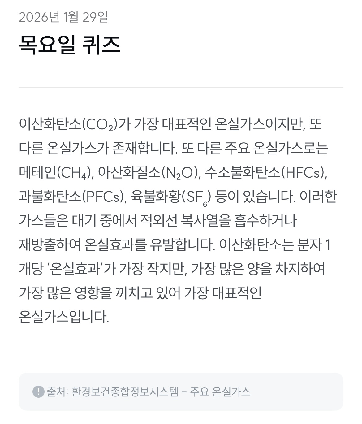 기후동행퀴즈 1월 29일 정답 공개! 대기 중 온실가스는 이산화탄소 외에도 메탄, 아산화질소 등 다양한 종류가 포함됩니다. 오늘의 기후행동 퀴즈로 환경 상식 업그레이드!