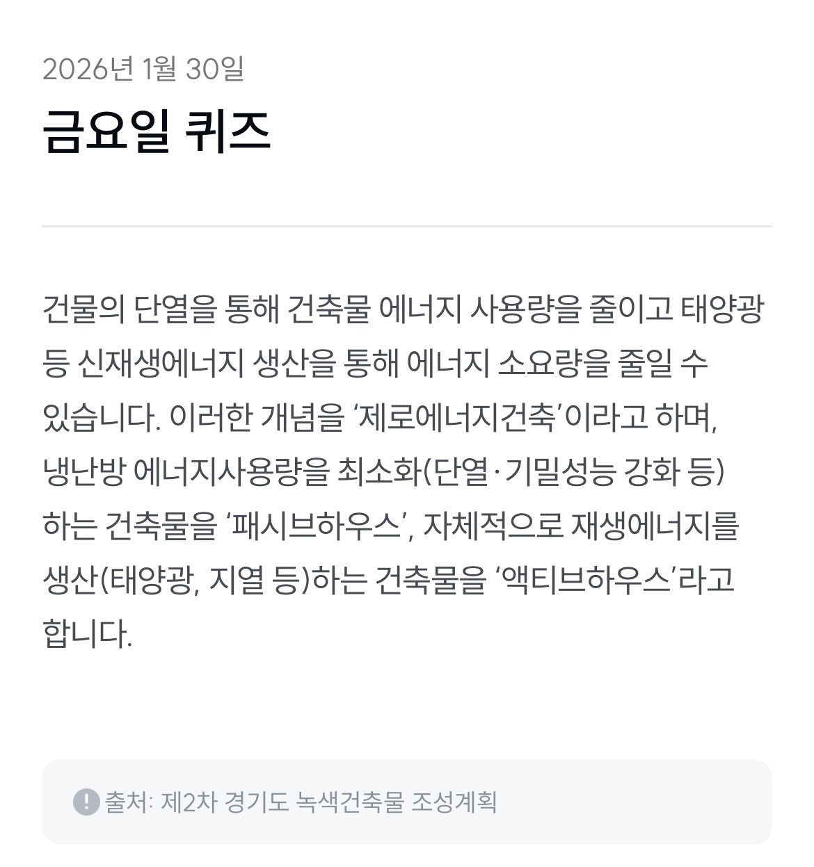 2026년 1월 30일 기후동행퀴즈 정답은? 건물 단열은 에너지 소비와 밀접한 관계가 있습니다. 패시브하우스, 제로에너지건축 개념까지 함께 알아봐요!